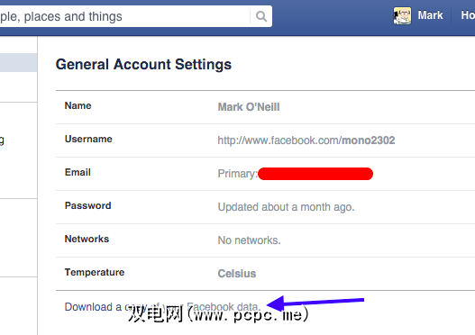 Facebook也非常容易检索您的数据。登录后,直接进入您的常规帐户设置,不要通过Go,不要收取200美元。在底部,您将看到: