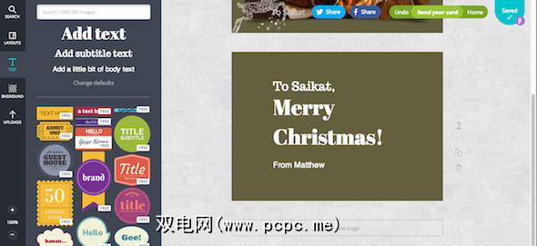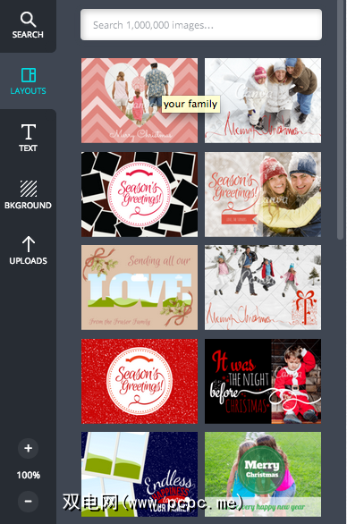 有大量的节日布局。大多数图片都装饰有圣诞节毛衣中令人上瘾的上镜家庭的图片,尽管您以后可以更改。要使用您喜欢的外观,只需单击它并将其拖到您的设计中即可。