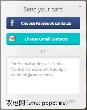 在发送圣诞节贺卡时,您有几种选择。您可以手动输入电子邮件地址,也可以将其发送给Gmail联系人或Facebook朋友。与在Canva上进行任何其他设计一样,您也可以将其下载为JPEG或PDF文件。