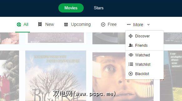 大量的电影通过四个选项卡进行组织:全部,新建,发现,和更多。最后一个为您提供其他显示选项:即将显示,好友和免费页面。
