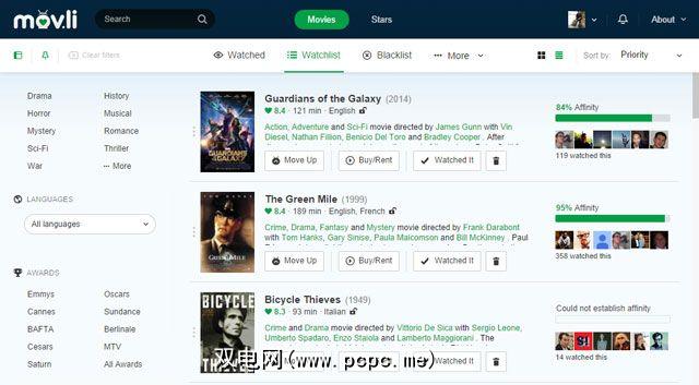 如果您像我一样是一个狂热者,您将很难找到您从未看过的电影。如果您确实在毛坯钻石(甚至岩石)中发现了一些钻石,请告诉Movli,并使用彩色条将电影移至个人监视列表并设置颜色优先级。黄色和橙色优先级较低,绿色优先级较高。将栏移到最左端,它变为红色。那是您不想触摸的电影的黑名单。