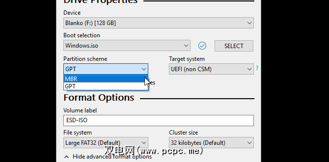 Rufus使您可以选择对于 UEFI 系统使用 GPT 文件系统,对于 BIOS 系统使用 MBR 。 Rufus可以检测到您拥有的系统,通常会为您选择合适的系统。如果您不知道自己所使用的系统类型,请让Rufus为您选择!