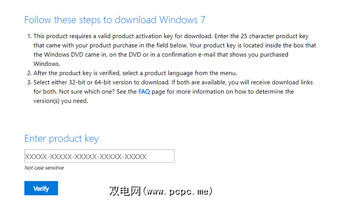 您可以直接从Microsoft获得Windows 7 ISO,但是您需要25个字符的产品密钥才能开始下载。您可以使用原始安装媒体,也可以从最初购买时的Microsoft电子邮件中找到Windows产品密钥。