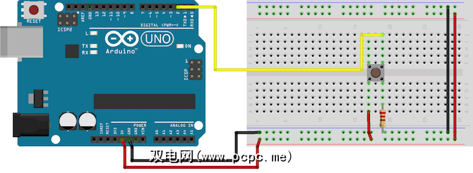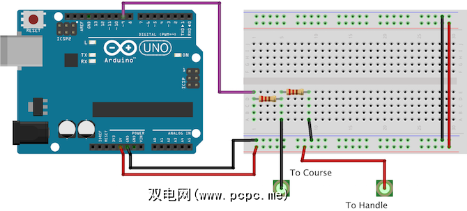 一个电阻将电路接地(称为下拉电阻),确保其不“浮动"(这使Arduino能够检测到电路变化)。另一个电阻器保护Arduino。当两个部分接触时,+ 5V进入数字引脚。如果不存在此电阻,则可能会出现短路故障–如果幸运的话,您的计算机将断开USB插座的连接,以吸收过多的电流。