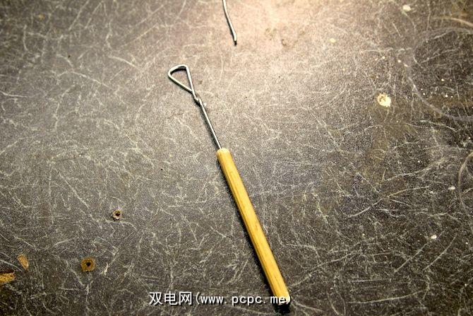 钻一个洞这个手柄。它必须足够大以适合金属环和导线穿过: