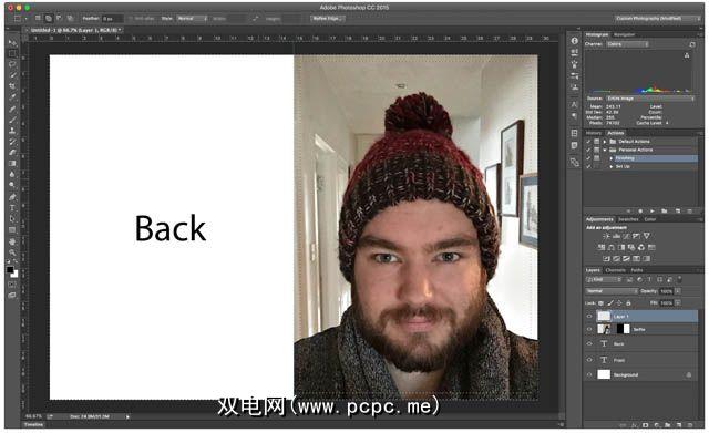 使用选取框工具,将选区拖到卡片的前半部分。前进的蚂蚁将向您显示已选择的内容。如果您使用的是模板,应该有一个指南来帮助您确定选择的位置。