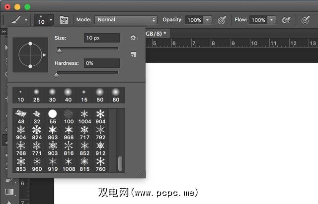 按 B 选择画笔,然后从“画笔预设"面板中选择您最近添加的雪花之一。添加一个新层,然后单击图像中的任意位置以添加它们。请注意不要在重要细节上涂上油漆!六:完成卡片