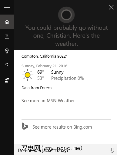 尽管Cortana配备了天气预报和路况预报,但该程序比温度清单更为人性化。如果您对当天是否需要雨伞或夹克感到好奇,只需询问Cortana 我今天需要夹克吗?以征询她的诚实意见。请记住,Cortana无法承受热量,因此最终会由您决定。