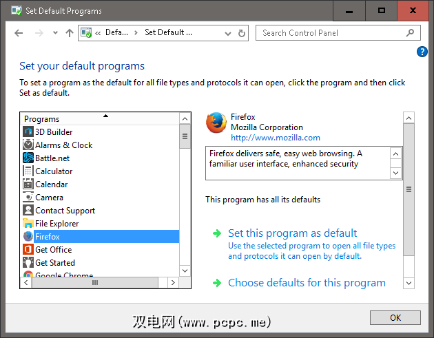 例如,如果您想更改默认的Windows 10浏览器Microsoft Edge ,对于Mozilla Firefox,只需在设置默认程序窗口中选择程序,Cortana就会通过浏览器的默认搜索引擎搜索答案。
