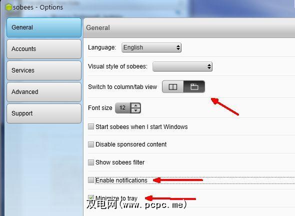 这可以使Sobees窗口较小,并保持在侧面桌面,但您仍可以根据需要切换并查看其他社交网络更新。您还可以通过取消选择“启用通知"并选择“最小化到任务栏"来减少Sobees的注意力。