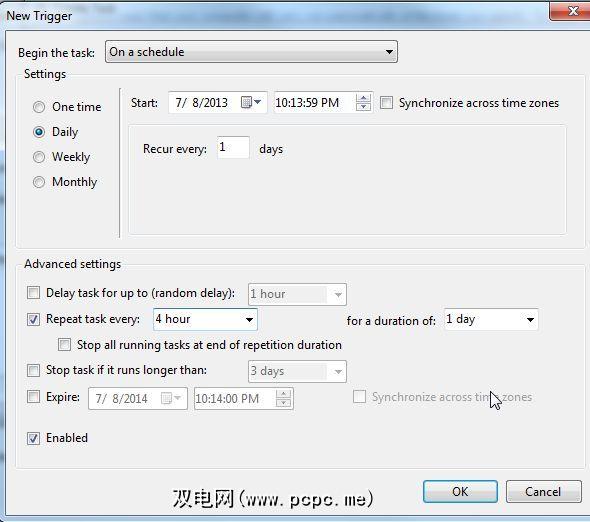 最后,创建第二个计划的任务,使其每隔4小时运行一次,但是将开始时间定为创建的第一个任务后约10分钟。