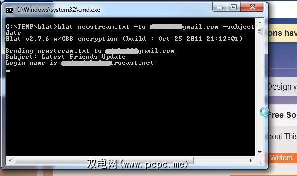 此设置的作用是:第一批作业使用FBCMD命令检查最后一批好友状态更新,并将其写入名为newstream.txt的文本文件中。然后,第二个批处理作业将该txt文件的内容通过电子邮件发送到您选择的电子邮件地址。这就是Blat在运行并通过Facebook状态更新文本文件发送时的样子。