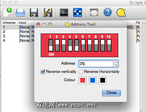 DMX地址是使用DIP开关在 binary 中设置的。从左边开始,开关代表的数字是2的幂,因此: 1,2,4,8,16,32,64,128,256 。如果您有第10个DIP开关,则很可能会选择模式。要将设备的地址设置为25,您可以将1st,4th和5th开关切换到on位置,这样我们得到1 + 8 + 16 =25。如果您在解决该问题时遇到麻烦,则包含一个有用的DIP计算工具在QLC +中–只需单击第一行中的蓝色图标–但请确保它与您的设备相匹配,该设备可能已关闭或处于打开状态。
