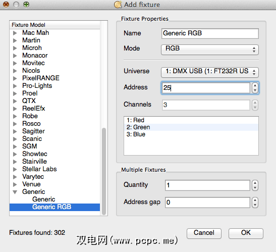 该对话框是来自不同制造商的固定装置的目录,因为每个设备都需要自己的配置文件,以准确了解功能以及如何控制这些功能。对于我们的测试用例,您需要“通用RGB"。输入您选择的地址,然后添加灯具。注意控制器使用3个通道;因此,如果您想要另一个控制器,则必须从28开始,以免重叠(唯一的例外是,如果您希望两个相同的设备执行完全相同的操作)。