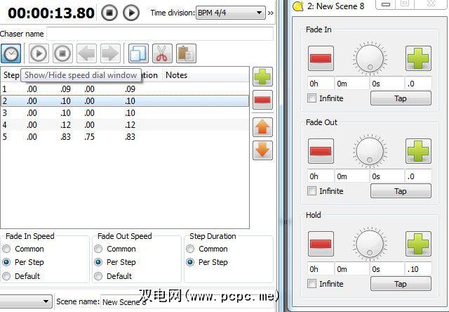 单击序列中的时钟图标编辑器打开一个单独的对话框,以输入淡入和保持时间。请注意,如果您希望每个步骤使用不同的值,请将“渐入速度"和其他设置更改为“每步"。如果您希望在所有步骤中保持一致的淡入淡出时间,请选择“通用"。 不要使用“默认"。