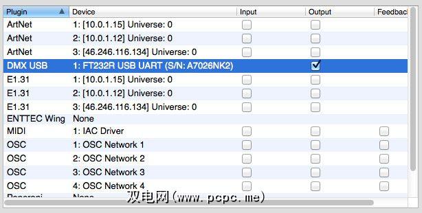 在左侧列表中找到“ DMX USB"-希望它显示一个序列号,然后单击它会显示设备运行正常的消息。选中输出框,将其分配为Universe 1的输出。