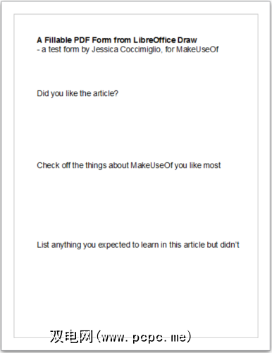 创建完表单后,导出PDF并在Adobe Reader之类的程序中尝试它,或在它的许多替代方法之一中进行尝试。您甚至可以测试我在LibreOffice Draw中为本文创建的可填充PDF。