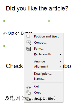 右键单击刚创建的选项按钮,然后选择“控件"。