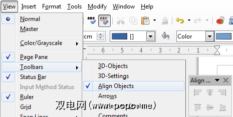 在PDF中放置的表单项中,您可能希望对其进行组织和对齐,因此看起来不像是一团糟。幸运的是,LibreOffice Draw有一个方便的“对齐"工具栏,您可以通过以下方式打开该工具栏:“视图">“工具栏">“对齐"。