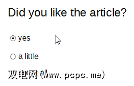 给这组选项按钮(代表一个问题的可能答案)命名。在此示例中,问题询问“您喜欢这篇文章吗?",三个选项分别是“是",“一点点"和“根本不"。我将选项按钮组称为“喜欢",并将第一个选项标记为“是"。