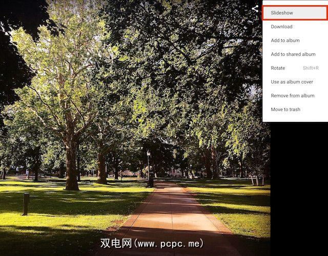 幻灯片显示:在查看相册中的图像时,请按右上方的“ 更多选项"按钮屏幕上的内容,然后单击“ 幻灯片放映"即可通过简单的导航控件(计算机上的向左和向右箭头键,在智能手机上滑动)来全屏查看所有照片。