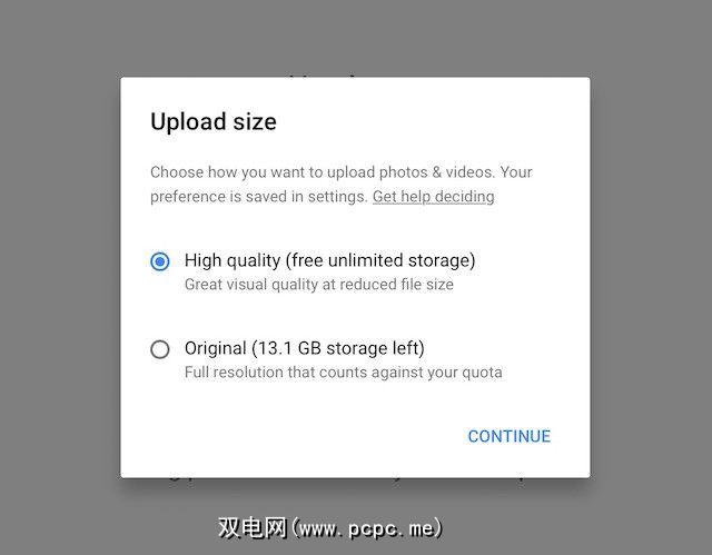 如果您的大多数照片都带有“ a"字样,则Google Photos建议您选择“高质量"存储选项。手机或相机的大小不到16兆像素。这将允许您访问免费的无限存储空间,以减小文件大小。
