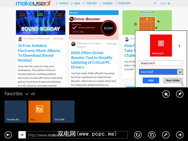Internet Explorer 11现在允许您从Modern应用程序管理收藏夹,而无需使用桌面应用。保存收藏夹时-点击星标以访问收藏夹,然后点击带有加号的星标-您将能够创建新的书签文件夹并对书签进行分类。然后,您可以从“收藏夹"栏中浏览收藏夹的文件夹。