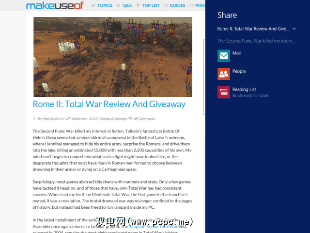 在查看网页时,通过向右轻扫或使用Windows Key + C快捷方式打开超级按钮栏,然后点击共享。您将能够与已安装的其他应用共享该页面。默认情况下,您可以使用Mail通过电子邮件发送链接,使用“人脉"应用将链接发布到社交网络,或将页面添加到阅读列表中。如果您安装了更多应用,则会在此处看到更多选项。例如,Twitter应用程序将允许您在Twitter上共享链接。
