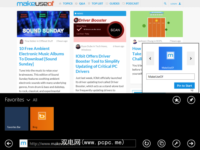 您可以将您使用的网站固定到“开始"屏幕,并为其提供自己的磁贴。只需单击或点击Internet Explorer应用栏上的星形按钮。然后点击固定图标,您将获得该网站的图块。