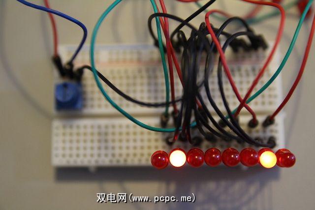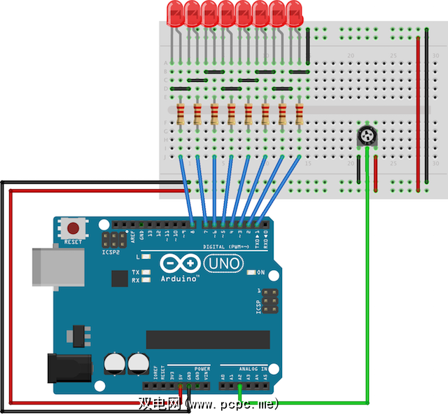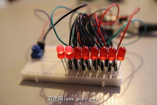 将每个LED的阳极(长脚)连接到数字引脚1至8。将阴极(短脚)连接到Arduino地面。