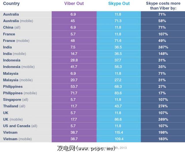 从美国到印度进行3分钟的通话,费用约为14.7美分。 Viber声称,这“比其他竞争服务低得多的每次通话价格"。当前,Skype是拨打廉价电话的最佳选择,但Viber要求更低的价格来进行竞争。这是Viber的图表,提供了两种服务的比较: