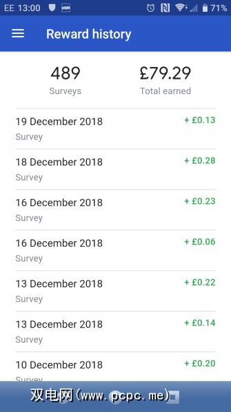 很高兴看到您的Play商店帐户中的余额不断增加。每次完成调查后,都会显示更新的余额。