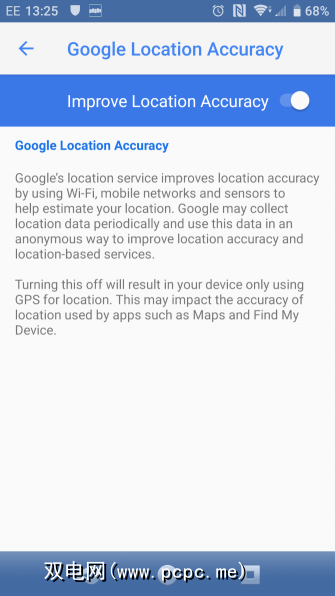 确保使用位置设置为打开,然后向下滚动高级并确认Google位置准确度也设置为打开。