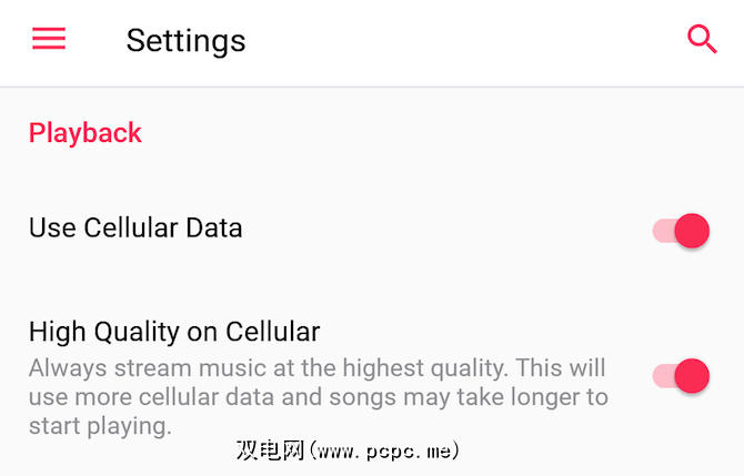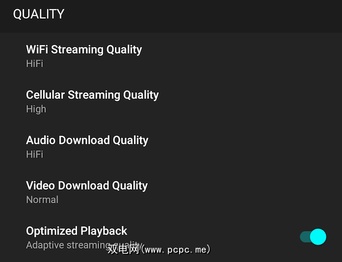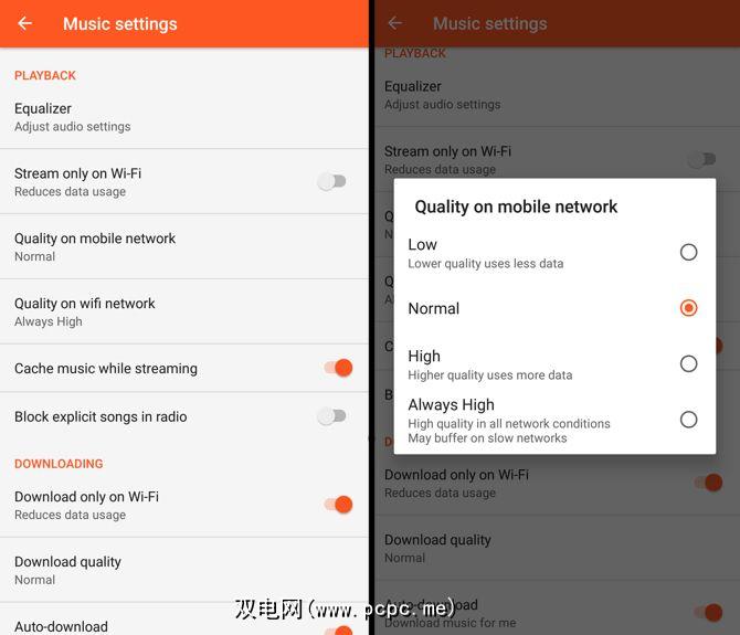 Google具有三种质量设置:低,正常和高。但是它拒绝透露比特率的含义。在不同的论坛上进行的有根据的猜测使它的平均值低至128 Kbps,正常时为192 Kbps,最高为320 kbps。另外,您可以对蜂窝和Wi-Fi数据进行不同的设置。
