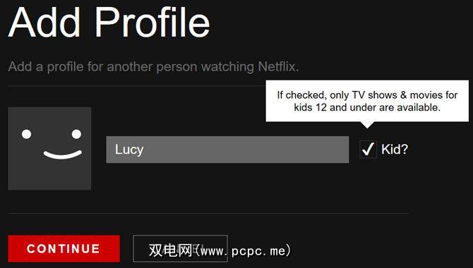 点击添加个人资料并输入一个名字。如果您选中孩子?旁边的复选框,则仅适用于12岁及以下儿童的电影和电视节目。完成后,点击 Continue (继续)按钮。