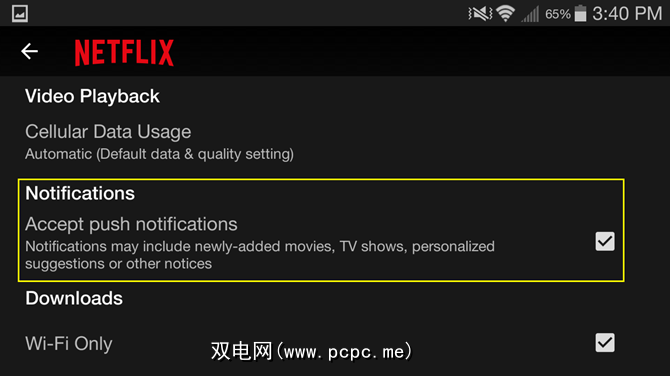 对于Android用户,您可能会注意到“通知"的其他设置。您可以选中该框以启用此选项,并接收有关新内容,建议或其他类型的Netflix通知的警报。