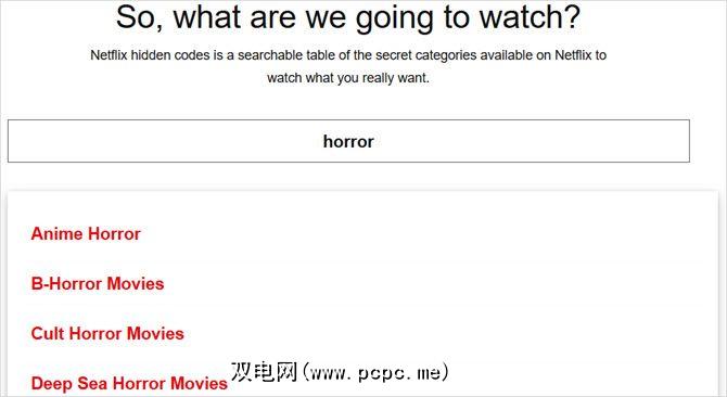 访问这些隐藏类别的便捷网站是Netflix隐藏代码。您可以浏览列表或在搜索框中输入关键字。单击选项之一,您将直接在netflix.com上看到该子类型的选项。