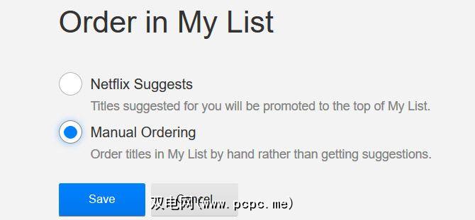 如果您希望确定列表中节目和电影的顺序,则可以可以轻松更改此设置。向下滚动到设置部分,然后点击在我的列表中订购。然后,标记手动订购单选按钮,然后单击保存。