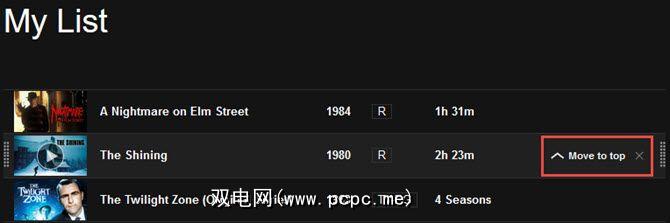 现在,只需单击顶部导航栏中浏览旁边的箭头,然后选择我的列表。然后,只需按所需顺序拖放内容即可。您还可以点击任意内容上的移至顶部,然后电视节目或电影将弹出至列表顶部。或只需单击 X 即可完全删除某项。