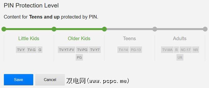 Netx,通过选择年龄组或使用滑块来调整PIN保护级别。完成操作后,点击保存。