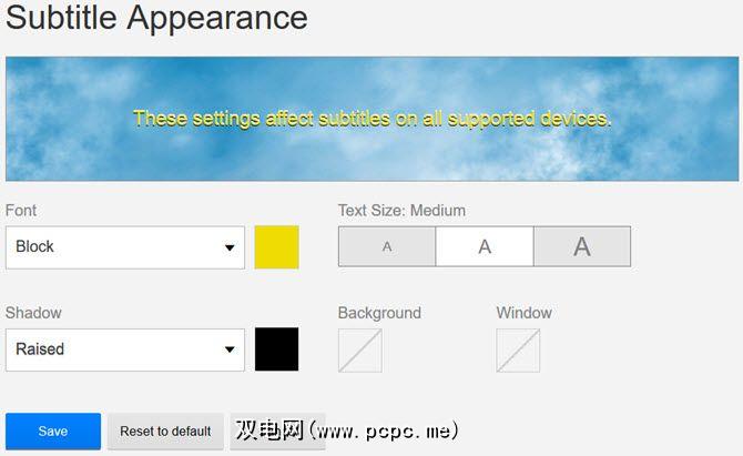 还可以为字幕添加一些特色,其中包括四个不同的阴影选项以及阴影颜色。最后,您可以根据需要选择背景和窗口颜色。在尝试使用这些选项中的每个选项时,顶部的示例将自动更改,以供您查看。完成后,单击保存。