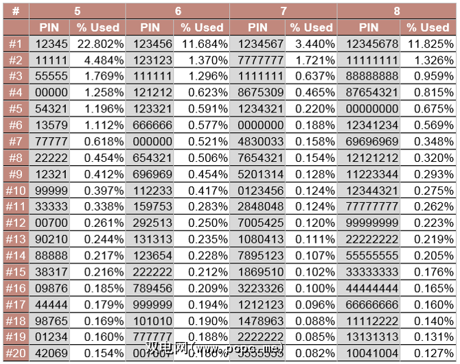 设置PIN时,请确保使用不明显的东西。 Data Genetics最近对PIN码进行了一次调查,上面的表格显示了700万样本中最常见的20种。
