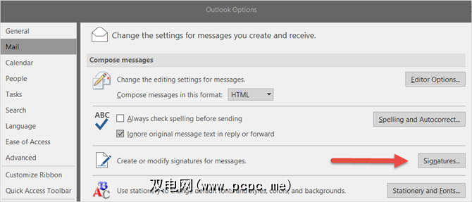 点击顶部的齿轮图标以打开您的设置。然后,选择选项>邮件>布局>电子邮件签名。