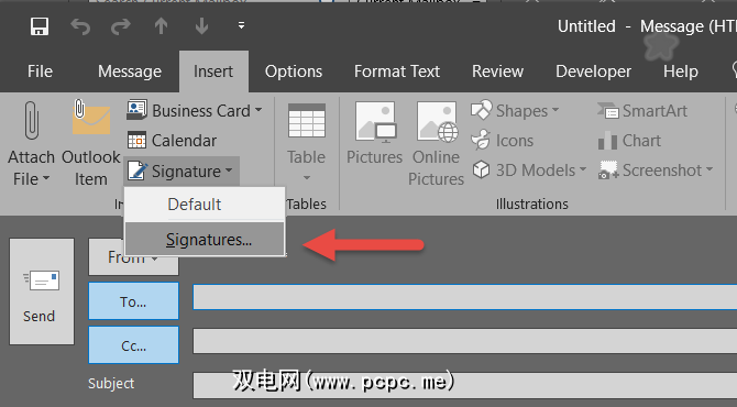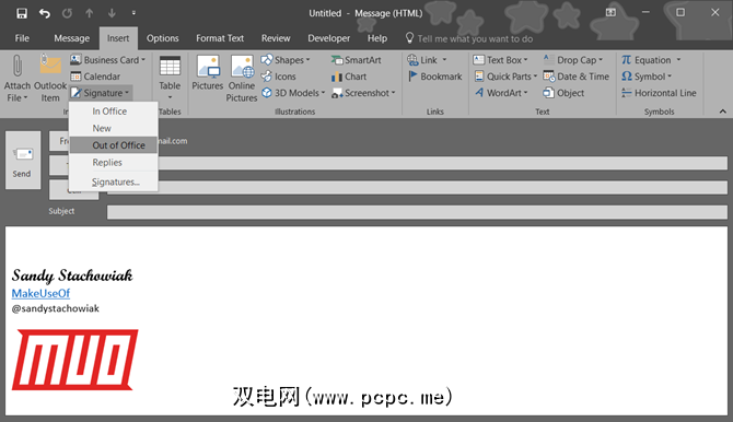 在新邮件窗口中,单击插入标签。然后,选择签名下拉框,然后选择要使用的签名。然后,您会看到您的选择立即弹出电子邮件,替换为默认值。
