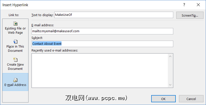 您会注意到,您也可以在同一框中链接到电子邮件,这是格式化电子邮件地址的另一种便捷方法。您甚至可以包含一个主题行,以便您知道消息是来自单击电子邮件中您的地址的用户。只需注意,用户可能可以使用自己的应用程序调整主题行。
