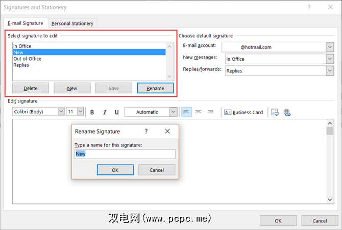 然后,在选择要编辑的签名框中选择签名的名称。在编辑器中进行更改,然后单击保存。如果需要,您也可以从该区域重命名您的签名。单击重命名,为其重新命名,然后单击保存。