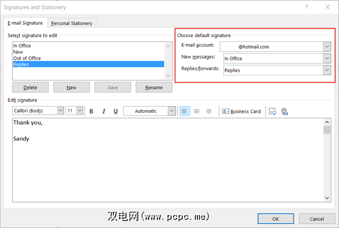因此,您将新电子邮件签名的名称保留在新邮件中>区域,然后创建另一个新签名,然后在答复/转发框中选择其名称。请记住,这些选择将默认插入到您的电子邮件中,但可以在发送之前在电子邮件中进行更改。