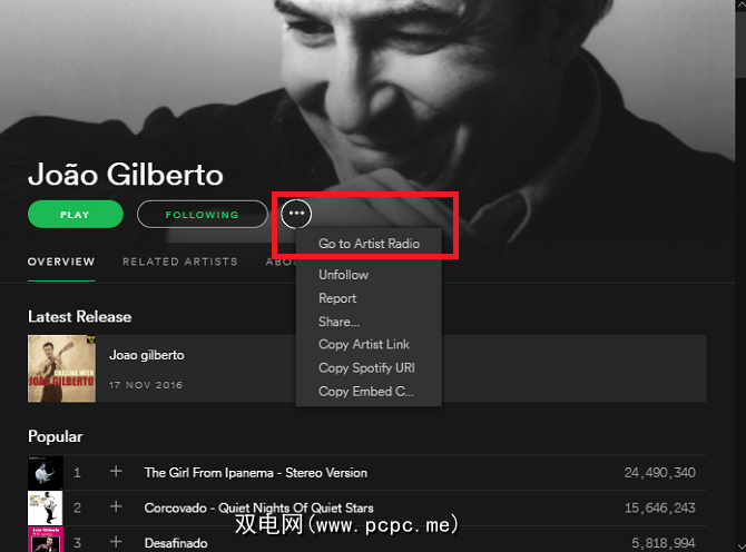 要激活特定频段的广播播放列表,请导航至其个人资料页面,单击头部的三个水平点,然后选择< strong>转到歌手电台。
