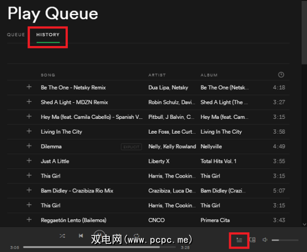一种简单的检查方法是查看您的Spotify监听历史记录(假设您已打开该功能)。要查看您的Spotify历史记录,请单击桌面应用程序上的队列图标,然后导航至历史记录标签。