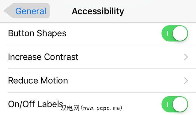在主辅助功能菜单中,您还可以找到按钮形状和开/关的选项标签。前者用阴影的背景箭头代替了显示在屏幕顶部的导航选项,某些用户可能会看得更清楚。 开/关标签为iOS切换开关添加了一个“ I",打开了一个“ O",这是一个很小的外观更改。